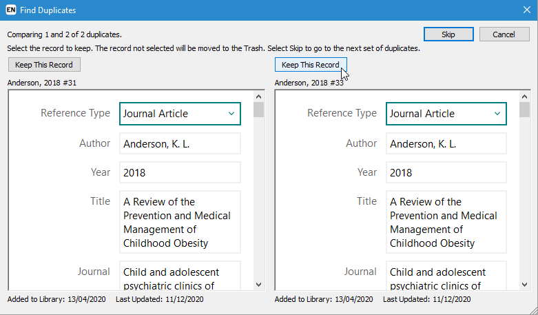 - Om de juiste van beide referenties te bewaren, klik je op Keep This Record. Met de knop Skip kan je beide versies behouden.