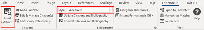 Met de Cite While You Write functie van Word kan je tijdens het schrijven je citaten invoegen en je referentielijst aanmaken op basis van je EndNote library. Je output style kies je in het tablad EndNote in Word.