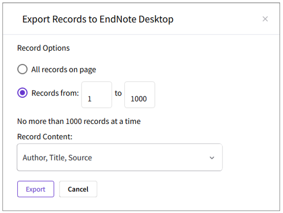 ≤ 1000 records: klik op Export to> EndNote Desktop > Number of records (aanduiden)