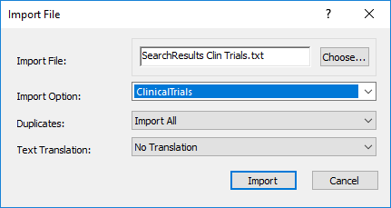 - In EndNote: klik op File > Import en selecteer je .txt-bestand. Kies de importoptie ClinicalTrials> Import