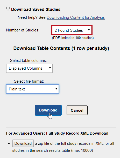 - Selecteer het formaat Plain Text > vink Include Abstract aan > Download en sla op
