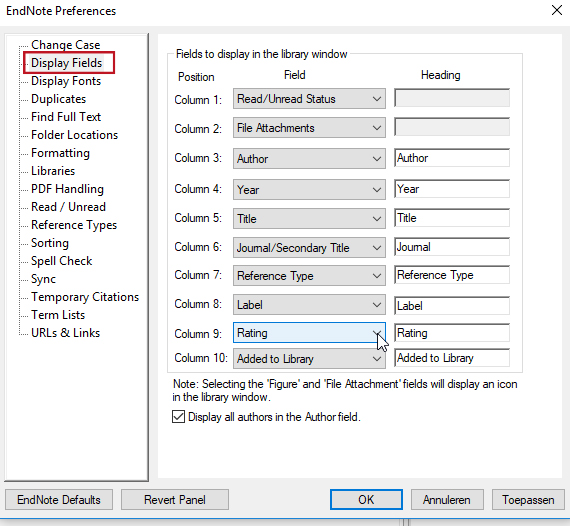 Je kan deze velden dan wel manueel nakijken per record, door ze zichtbaar te maken via Edit > Preferences > Display Fields (Author en Reference Type aanvinken)