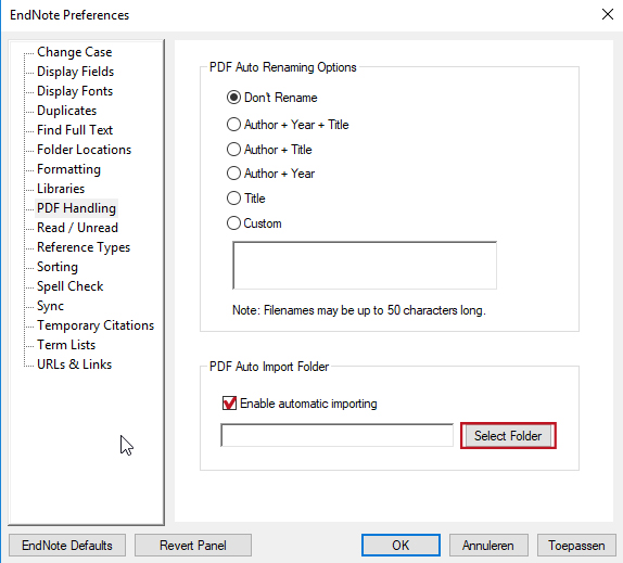 - Vink onder PDF Auto Import Folder het vakje met Enable automatic importing aan (zie afbeelding)