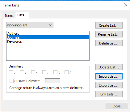 - Klik op menu Library> Open Term List > Journals Term lists. Klik op tabblad Lists > Journals > Import List > Medical.txt openen.