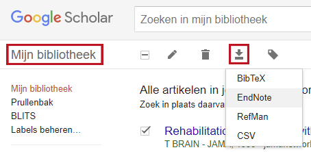 Open ‘Mijn bibliotheek’ (rechts onder inloggen) en selecteer de nodige referenties