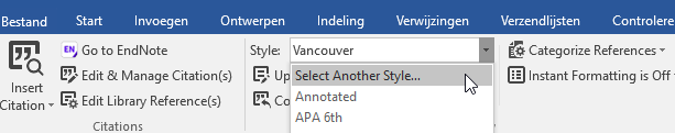 Opmerking: Zorg ervoor dat je je referentiestijl altijd in Word kiest en aanpast en niet in EndNote.